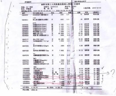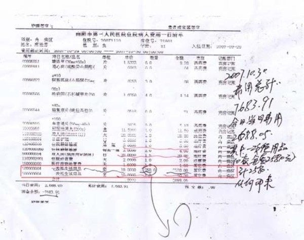 李冰拿著一厚厚一沓子住院清單說(shuō),每次住院時(shí)交100元押金后,病人即可使用醫(yī)院提供的被褥、茶瓶等物品,此外連一圈衛(wèi)生紙他們也沒用過(guò),根本不知道價(jià)值10元錢的一次性用品是什么,何況一天竟用了258套!李冰還用筆把下列她認(rèn)為沒有消費(fèi)的項(xiàng)目作了標(biāo)記:2007年11月8日,開蜂蜜5瓶,計(jì)費(fèi)115元;奇正消痛貼10盒,計(jì)費(fèi)142元;2008年1月6日,開山甲若干,費(fèi)用552.50元;2007年11月8日陪護(hù)床位20張;2008年5月4日陪護(hù)床位15張。