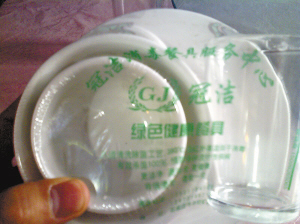 這兩家產(chǎn)品一個名叫“冠潔”,一個名叫“天康”。飯店老板告訴記者,名為“冠潔”的餐具是最近才進(jìn)入市場的,而名叫“天康”的餐具則已經(jīng)有了一段時間。“冠潔餐具的老板是我們礦區(qū)衛(wèi)生局長的丈夫,他親自登門推銷,我們也不敢說什么,只好用一些。”