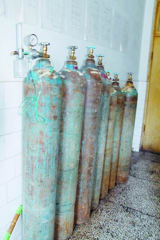 尉氏縣一些群眾向記者反映,尉氏縣第二人民醫(yī)院繼續(xù)使用工業(yè)氧冒充醫(yī)用氧。昨天上午,記者來到該院病房樓一樓內(nèi)科住院部,在一個(gè)標(biāo)注有搶救室的房間里,放著7個(gè)氧氣鋼瓶,沒有醫(yī)用氧氣合格證、沒有藥品批準(zhǔn)文號(hào)、沒有生產(chǎn)日期,甚至鋼瓶上沒有氧氣生產(chǎn)廠家的名字。有的鋼瓶上的檢驗(yàn)標(biāo)志注明使用時(shí)間為2004年至2007年。一個(gè)鋼瓶上還裝著吸入器,病房內(nèi)的患者告訴記者,患者吸的就是鋼瓶內(nèi)的氧氣。