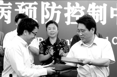 市疾控中心主任鄧瑛(右)與科興公司簽訂首批500萬人份甲流疫苗。記者歐陽曉菲攝