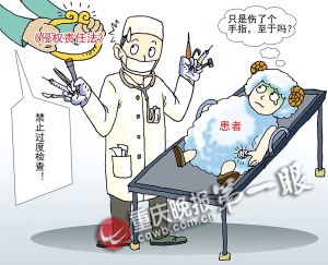 “下月起,醫(yī)院再對患者進(jìn)行過度檢查屬于違法!敝貞c合縱律師事務(wù)所徐桂鵬律師介紹,《侵權(quán)責(zé)任法》7月1日起正式施行,該法對過度檢查作了明確禁止性規(guī)定。