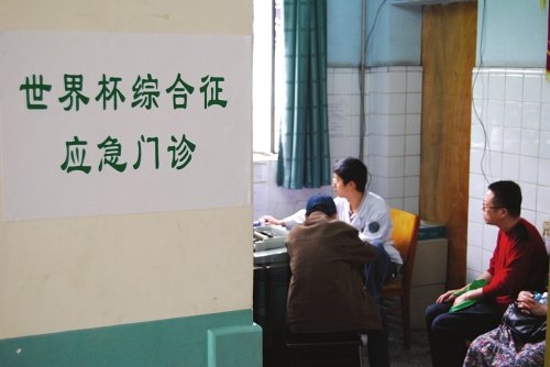 9名醫(yī)生中除了一名女醫(yī)生,其他的人全是球迷。世界杯期間,為了滿足球迷患者的需要,急診科輸液室的大電視凌晨也會(huì)播放比賽。但“世界杯綜合征應(yīng)急門診”的醫(yī)生們卻沒有這么幸運(yùn),為了保證工作質(zhì)量,門診室內(nèi)不會(huì)設(shè)電視機(jī)。急診科副主任項(xiàng)濤說:“沒法,工作為主,只能看轉(zhuǎn)播了。”