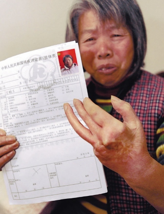 若干年前的一次工傷,讓沈河區(qū)北二經街的居民王桂蘭成為國家三級肢殘。但這一事實在上周五被“改變”了,在經歷了一次新殘疾證換證的例行體檢之后,60歲的王桂蘭被醫(yī)生告知,她已經是“正常人”了。這一結果讓王桂蘭大惑不解,她舉著殘廢的左手質問醫(yī)生,“為啥?”醫(yī)生回答:“你必須手指頭全沒了才能算殘疾!