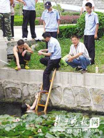 女子與眾人僵持了半個(gè)小時(shí)后,一位民警無意中與其提到“錢”,該女子突然表現(xiàn)出極大的興趣:“你給我錢,我就上去!泵窬统鰞蓮埌僭筲n在岸上晃了晃,哄道:“先上來,上來我就給你!痹诒娙说膭裾f和鈔票的吸引下,該女子終于同意穿上衣服上岸。在上岸之前,她還從河中摘了一朵蓮花獻(xiàn)給警察,以示“感謝”。據(jù)悉,該女子姓孫,35歲,11年前,因戀愛問題,患上狂躁癥,先后多次被送到精神病院治療。(紹平 萬春 李根 小川)