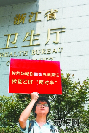 左思右想,這個(gè)22歲的年輕人決定再進(jìn)行一次行為藝術(shù)。他還是用那根宿舍里晾衣服的撐衣竿,然后粘上了一張從廢紙箱上扯下的紅色紙板,做成了一個(gè)自制的標(biāo)語(yǔ)牌,上面是最近互聯(lián)網(wǎng)上最為流行的句式:“浙江省衛(wèi)生廳,你媽媽喊你回家辦健康證,檢查乙肝兩對(duì)半!