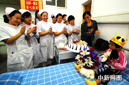 “祝你生日快樂, 祝你生日快樂”, 9月28日上午9時許,從江西九江學(xué)院附屬醫(yī)院住院部八樓的光明.微笑愛心病房里傳出歡快的生日祝福歌,醫(yī)護人員正在給小患者小胡慶祝生日。