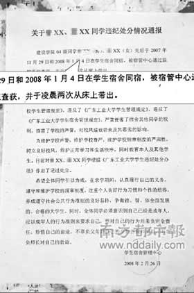 1月4日,廣州大學(xué)城某工業(yè)大學(xué)一女生留男生在宿舍過(guò)夜被學(xué)校抓獲,兩人近日被學(xué)校記過(guò)處分。這是該校在大學(xué)城校區(qū)首次對(duì)男女同宿現(xiàn)象公