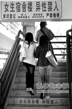 下午4點(diǎn),記者在其中一棟男生樓進(jìn)行了觀察。30分鐘內(nèi)共有5名女生,從沒(méi)設(shè)門崗的出入口進(jìn)入男生樓。1個(gè)手提快餐,準(zhǔn)備上樓的女孩告訴記者,她常常到男生宿舍玩,“4年來(lái)好像只登記過(guò)1次,管理員極少上門檢查”。