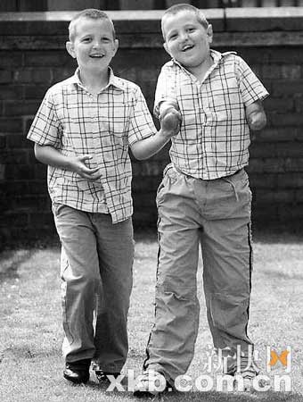 去年5月,愛德華最終戰(zhàn)勝病魔,身體狀況也奇跡般地好了起來。過去1年來,堅強的愛德華從未因失去雙腿和雙手而沮喪哭泣,而是以積極樂觀的態(tài)度面對。5月初,愛德華在諾丁漢市的醫(yī)院,首次安裝上了一套價值數(shù)萬英鎊的高科技“人工假腿”。有趣的是,愛德華一直希望自己能比雙胞胎哥哥威廉更高一些,因此他特意要求醫(yī)生將他的“新腿”做得更長一些,F(xiàn)在,他比威廉高了大約5.08厘米。
