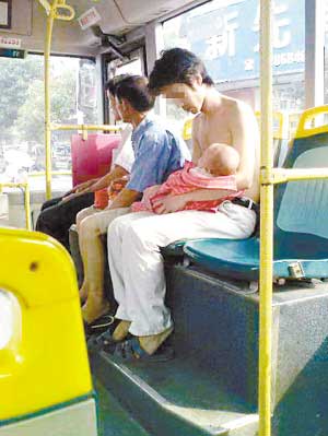 昨天(24日)下午4時左右,在廣東省東莞36路公交車上,由于車內空調涼爽,患感冒的小女嬰一上車就打起瞌睡,父親阿勇(化名)趕忙脫下襯衣包裹住懷中的女兒。乘客對赤膊的阿勇贊彈不一,有男乘客認為阿勇脫衣裹蓋女兒是父愛的表現(xiàn),無可厚非;有女乘客則認為阿勇在公眾場合打赤膊不雅,影響了東莞的城市文明形象。