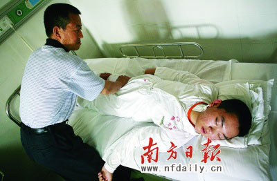 1994年,從兒子在卡車上摔下癱瘓那一天起,黑龍江伊春市湯旺河區(qū)二清河林場的丁國福就開始了漫長的奔波。為了讓兒子早日站起來,丁國福不惜傾家蕩產(chǎn),甚至當(dāng)乞丐。昨日,人稱“丁百萬”的丁國福帶著兒子來到廣州解放軍四二一醫(yī)院求醫(yī)。