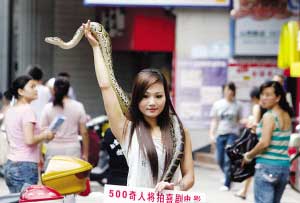 這名自稱叫“優(yōu)優(yōu)”的年輕女子說,她今年22歲,陜西人,曾是專業(yè)舞蹈演員。她從小不怕蛇,3年前自己養(yǎng)起了蛇,剛開始由于缺乏專業(yè)養(yǎng)殖知識,死了好幾條蛇,她為此十分難過,F(xiàn)在她對“蛇性”相當了解,還學起了蛇舞、印度舞、肚皮舞。優(yōu)優(yōu)指指脖子上的蛇稱,這是條緬甸蟒,10多斤重,進食胃口很大,不僅要吃豬肉,而且一次能吃七八只和鴿子差不多大小的鳥。由于養(yǎng)蛇,這幾年來優(yōu)優(yōu)一直單獨一人居住,“沒幾個人不怕蛇的,我只能帶著蛇單獨過!睅邅怼肮洹鄙轿髀,優(yōu)優(yōu)另有目的,她背后的胡導稱,他計劃花5年時間搜集500個奇人,拍攝奇人喜劇電影,讓他們展示各自絕技,目前有人愿出數(shù)百萬拍攝。
