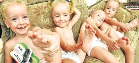 自從采取這一“腳趾頭”文身點(diǎn)痣的區(qū)分法后,布里德拉夫再也沒有搞錯過同卵四胞胎女兒的身份。即使她們的外貌再相似,只要她們伸出自己的小腳丫,就會泄露出各自的身份秘密。謝莉高興地說:“我們現(xiàn)在再也不會搞錯她們的身份了!
