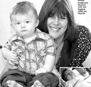 英國西約克郡彭特弗萊克市41歲女教師斯蒂芬妮·蒙頓16年前生下第一個(gè)女兒安布時(shí),她以為自己生下了一個(gè)“巨嬰”,因?yàn)榘膊忌聛砭怪剡_(dá)9.6斤。然而令斯蒂芬妮做夢也沒想到的是,她又接連生下了另外3個(gè)兒女,并且這些孩子就像暗暗較勁一樣,出生時(shí)一個(gè)比一個(gè)重,斯蒂芬妮最小的孩子、如今7個(gè)月大的查利出生時(shí)竟重達(dá)12斤!斯蒂芬妮發(fā)誓以后再也不敢懷孕了,因?yàn)樗裏o法想象如果自己再生第5個(gè)孩子,這個(gè)孩子的體重將會(huì)多驚人。