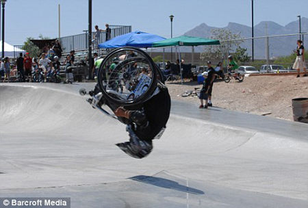現(xiàn)年16歲的亞倫·佛斯靈漢姆(Aaron Fotheringham)被朋友們稱作“車輪” 。1991年11月出生在美國內(nèi)華達(dá)州的拉斯維加斯的他,患有脊柱分裂的先天疾病, 從3歲起就不得不依靠輪椅生活。但是,他卻成為了輪椅上完成后空翻高難度動作的第一人(目前唯一的一個),他也因這一壯舉在2008年10月入選了吉尼斯世界紀(jì)錄。