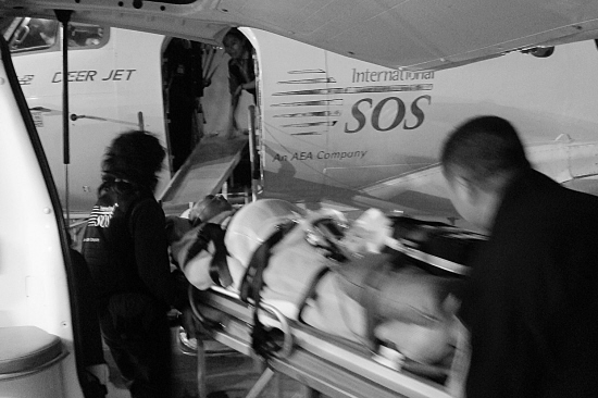 前天晚上7點(diǎn)10分,“SOS”(國際救援中心)的專機(jī)徐徐降落在溫州永強(qiáng)機(jī)場內(nèi),專機(jī)上迅速下來兩位醫(yī)護(hù)人員將大批醫(yī)療器械搬上了等候已久的120急救車上,隨即向溫州市區(qū)駛?cè)ァ?/p>