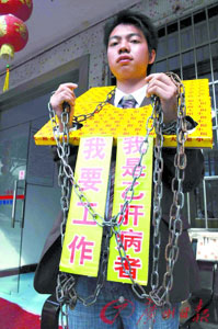 “我是乙肝病者,我要工作”,2月13日上午,廣州南方人才市場附近,來自江西的大學(xué)生羅思文眉頭緊皺地戴著自制的紙“枷鎖”,透過掛在胸前的標(biāo)語,發(fā)出那痛徹心扉的無聲吶喊。此前,羅思文費(fèi)盡千辛萬苦通過了一家用人單位的考核,卻因?yàn)椤按笕枴倍痪苤T外。