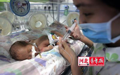昨日,記者在醫(yī)院的新生兒監(jiān)護(hù)病房看到,三個(gè)小男孩兒都躺在保溫箱里。據(jù)兒科醫(yī)生介紹,三個(gè)孩子都是低體重早產(chǎn)兒,出生時(shí)孕周為33周多。老大是1.58公斤,老二和老三是1.55公斤,自3月16日出生到現(xiàn)在已經(jīng)度過(guò)了呼吸關(guān),還有感染關(guān)、喂養(yǎng)關(guān)、黃疸關(guān)在等待著他們。這兩天護(hù)士已經(jīng)開(kāi)始通過(guò)鼻飼管注射給他們喂奶了,三個(gè)孩子每次分別給注射7毫升、3毫升和4毫升,2個(gè)小時(shí)喂一次。從目前來(lái)看,除老大有點(diǎn)貧血外,三個(gè)孩子心肺功能腦部發(fā)育都很好,預(yù)計(jì)還有2到3周孩子們才能出保溫箱。