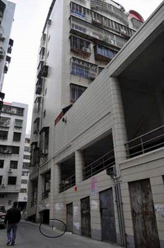 吳阿伯從9樓水塔邊跳下墜地(畫圈處)