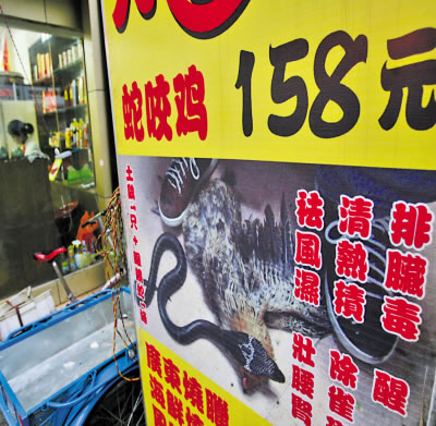 “打死我都不敢吃!”市民劉先生在黃泥塝看到某餐館推出的“蛇咬雞”招牌后說,這些吃法太怪了。劉先生介紹,招牌上還說,吃“蛇咬雞”可以醒腦、除雀斑、排臟毒、祛風濕等。“這不僅太殘忍,太血腥,也不道德。”張女士說,希望這僅僅是個別餐館吸引顧客而搞的噱頭。