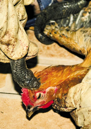 昨晚6點半,記者來到黃泥塝這家餐館,顧客們也陸續(xù)到該店就餐!芭律蹲樱覀兌汲赃^好多次了!”這時,5名壯漢剛進店坐上桌,其中一食客便大聲吆喝來道“蛇咬雞”。“來啦!”隨即,一身著工作服的男子應(yīng)聲從廚房走出。只見他雙手戴著皮手套,左手提著一個方形鐵絲籠,右手抓著一只母雞來到食客面前。記者看到,籠子里約有七八條眼鏡蛇蜷縮成一團,不停地蠕動。