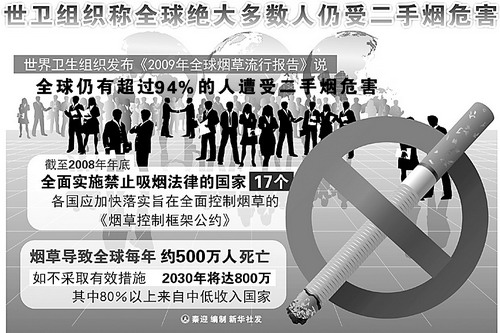 2008年10月30日,來自全國的400家環(huán)保民間組織的代表在北京發(fā)出共同聲音:吸煙是污染環(huán)境的行為,應(yīng)當(dāng)維護(hù)被動吸煙者、維護(hù)環(huán)境的合法權(quán)益。他們呼吁盡快制定并頒布控?zé)熖貏e是公共場所禁煙的法律、法規(guī),并有效監(jiān)督實(shí)施。根據(jù)中華環(huán)保聯(lián)合會《被動吸煙的調(diào)查問卷報告》,85%的受調(diào)查公眾不清楚被動吸煙對人體健康造成危害的嚴(yán)重性。而目前,我國的吸煙人數(shù)達(dá)到3.5億,被動吸煙人數(shù)高達(dá)5.4億。我國于2003年11月10日簽署了世界衛(wèi)生組織的《煙草控制框架公約》,2006年1月9日,該《公約》在我國生效。