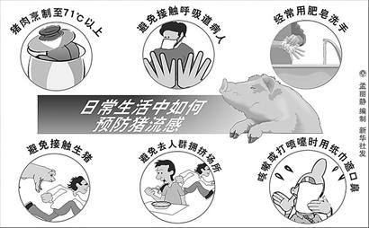 避免接觸流感樣癥狀(發(fā)熱,咳嗽,流涕等)或肺炎等呼吸道病人;注意個人衛(wèi)生,經(jīng)常使用肥皂和清水洗手,尤其在咳嗽或打噴嚏后;避免接觸生豬或前往有豬的場所;避免前往人群擁擠場所;咳嗽或打噴嚏時用紙巾遮住口鼻,然后將紙巾丟進垃圾桶;如在境外出現(xiàn)流感樣癥狀(發(fā)熱,咳嗽,流涕等),應立即就醫(yī)(就醫(yī)時應戴口罩),并向當?shù)毓残l(wèi)生機構(gòu)和檢驗檢疫部門說明。