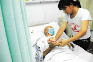 昨日(26),西南醫(yī)院,女兒正為父親擦手 記者 張路橋 實習生 胡健 攝