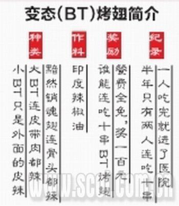 “BT辣就是變態(tài)辣!钡曛骱壬脕硪环莶藛握f,“BT烤翅”旁特意寫著膽小者勿嘗,辣死人他們不負責(zé)。據(jù)介紹,“BT烤翅”分為大BT和小BT兩種,小BT只是外面的皮辣,大BT連皮帶肉都辣,至于超級極品——“黯然銷魂翅”則連里面的骨頭也是辣的。