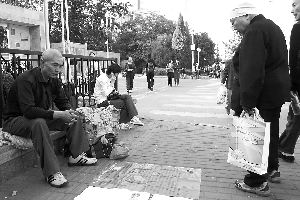 昨日下午,陳松發(fā)在人民大學(xué)東門旁的便道上乞討,一名過路的女士掏出420元錢塞進(jìn)陳松發(fā)手中,頭也不回地走了。陳松發(fā)的弟弟趕緊追了上去。