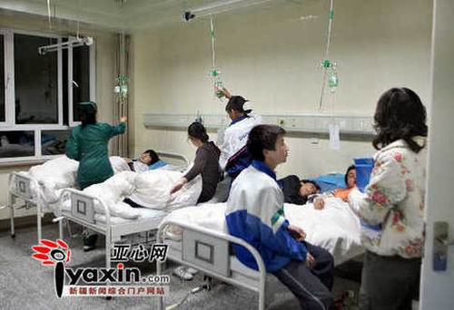 當(dāng)天22時(shí)30分左右,記者趕到救治學(xué)生最多的昌吉市人民醫(yī)院時(shí),只見(jiàn)一樓的兩個(gè)病房里,每張病床上都躺著一名或是兩名學(xué)生,他們都在輸著液體。而在另外一個(gè)輸液室里,至少坐著二十名身著校服的學(xué)生,他們都在輸著液,但從他們的表情看,癥狀應(yīng)該較輕。在這些病房的門口,記者發(fā)現(xiàn),每個(gè)病房的門口都有一名成年人在把守著,當(dāng)記者試圖想進(jìn)入病房時(shí),就被這名成年人攔住不讓進(jìn)。并稱他們是學(xué)生的老師,所以采訪他們均不接受。
