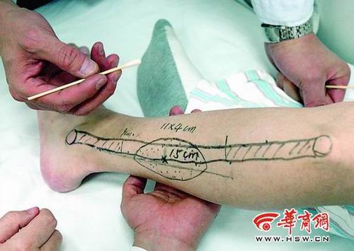 手術陣容強大,頜面外科劉彥普、何黎升等多名專家分批輪流為強強實施下頜骨再造術。醫(yī)生們?yōu)閺姀娫僭炝艘粋“下頜關節(jié)”,而強強的下巴將由取自他小腿腓骨的一塊骨頭移植重塑。手術分兩組進行,一組醫(yī)生做面部的處理,另一組醫(yī)生在左側小腿切取血管化腓骨復合瓣,塑為下頜骨形態(tài),然后移至面部,在顯微鏡下吻合微血管,最后將重塑的下頜骨固定在下巴處。