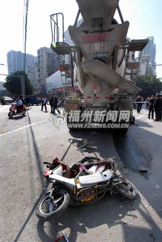 上午11時35分左右,記者趕到事故現(xiàn)場時,一輛水泥攪拌車停在靠近匯多利建材市場旁的路口,被撞壞的電動車零件散落一地,倒在一旁。水泥攪拌車后輪后留下一道長長的鮮血痕跡。