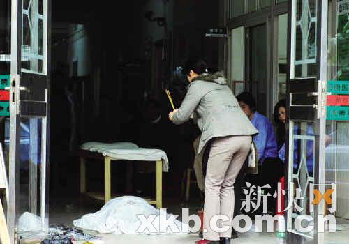 前日上午11時(shí),記者在事發(fā)醫(yī)院看到,醫(yī)院門口拉起警戒線,兩名警察在維持秩序。醫(yī)院樓前堆放著一些桌椅,門前撒了一地紙屑。門診大廳的過道上聽放著死者遺體,一名婦女在旁焚紙燒香,廳內(nèi)還有不少人聚集,哭聲陣陣。