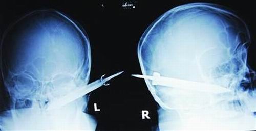 昨晚(1月13日)6時10分左右,西安交大醫(yī)學院第一附屬醫(yī)院急診科里擠滿了前來就診的病人。當文文沖進急診室,在此送家人就診的賀女士差點被嚇暈過去,人們看著這個病人,張大了嘴巴,瞪大了眼睛,嘈雜的急診室一時很安靜。“年齡38歲,家住東八里村……”思維清楚,張嘴艱難的文文向急診科的梁醫(yī)生簡單講述了事情經(jīng)過:頭上這把刀是父親刺的。
