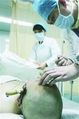 昨晚7時40分,剛被推出CT檢查室的文文,已被剃光了頭,頭上的黃色木刀把在燈光下反光。嘴巴、鼻子周圍的血已經(jīng)凝固。