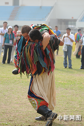 中新網(wǎng)泉州10月31日電 (劉通)今天上午,第六屆全國(guó)農(nóng)民運(yùn)動(dòng)會(huì)在福建泉州繼續(xù)進(jìn)行。“搏克”(蒙古族摔跤)雖是本屆農(nóng)運(yùn)會(huì)中國(guó)式摔跤比賽中的一個(gè)小項(xiàng),但卻極富觀賞性和趣味性。無論服飾、入場(chǎng)儀式還是比賽規(guī)則都帶有獨(dú)特鮮明的民族色彩。