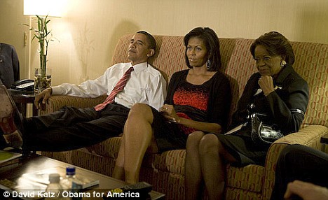休息時刻,可能是在為發(fā)表獲勝講演作準備,奧巴馬將腳放在桌子上,身體向后倒去。