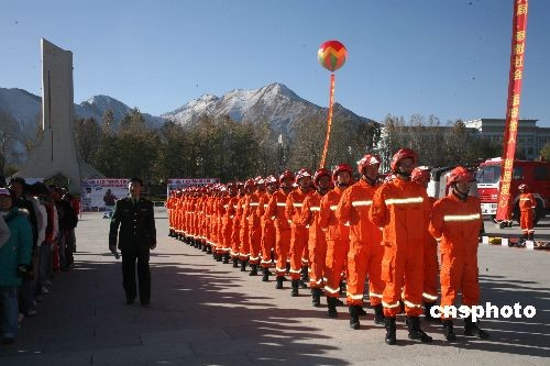 圖為擔(dān)負(fù)消防、救災(zāi)等任務(wù)的西藏救援武裝力量首次集體亮相。