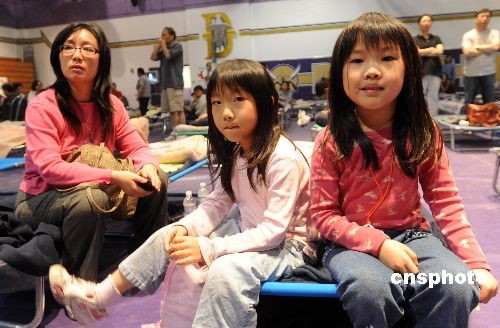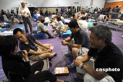 洛杉磯縣鉆石吧市被迫緊急撤離的華裔居民正在庇護(hù)所內(nèi)打撲克牌。中新社發(fā) 張煒 攝