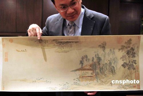 圖為預(yù)料成交價超過一千二百萬港元的仇英名作《采蓮圖》,這幅精美的手卷曾被清朝乾隆皇帝收藏。中新社發(fā) 譚達(dá)明 攝