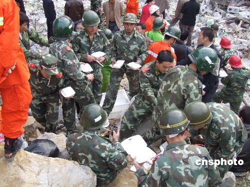 消防等救援人員匆忙進食以繼續(xù)搜尋山崩失蹤者。中新社發(fā) 周恩革 攝