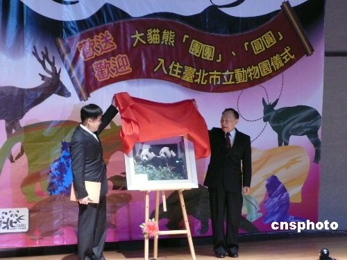 圖為歡送“團(tuán)團(tuán)”“圓圓”赴臺(tái)代表團(tuán)團(tuán)長(zhǎng)趙學(xué)敏和臺(tái)北市長(zhǎng)郝龍斌共同為“團(tuán)團(tuán)”“圓圓”基因檔案大幅照片揭幕。