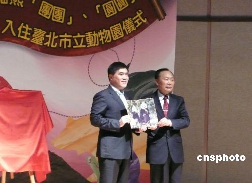 圖為歡送“團(tuán)團(tuán)”“圓圓”赴臺(tái)代表團(tuán)團(tuán)長(zhǎng)趙學(xué)敏向臺(tái)北市長(zhǎng)郝龍斌贈(zèng)送“團(tuán)團(tuán)”“圓圓”基因檔案,象征交接正式完成。