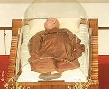 昨天政、商、宗教各界代表及信眾們前往瞻仰法師最后一面。方丈和尚向來(lái)賓講解懸掛堂中,書(shū)法家杜忠誥老師所寫(xiě)的師父最后叮囑“寂滅為樂(lè)”以及四句偈“無(wú)事忙中老,空里有哭笑,本來(lái)沒(méi)有我,生死皆可拋。”說(shuō)明圣嚴(yán)法師一向“歡喜看生死”的態(tài)度。