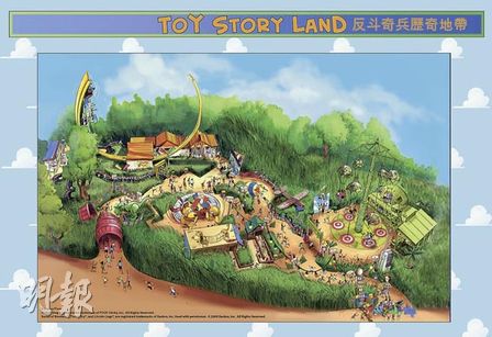 以電影《反斗奇兵3》為骨干,在區(qū)內(nèi)擺放各式超巨型玩具,旅客置身其中,如變了小矮人。區(qū)內(nèi)有3個(gè)機(jī)動(dòng)游戲:其一是賓客坐上如“臘腸狗”的設(shè)施,經(jīng)歷一段顛簸旅程;另一設(shè)施是一臺(tái)穿梭飛車,接載賓客沿高達(dá)數(shù)十呎的U形軌道快速來回;最后是一個(gè)“跳傘”訓(xùn)練旅程,賓客可因應(yīng)喜好,調(diào)校從25米高臺(tái)向下急墜的速度。