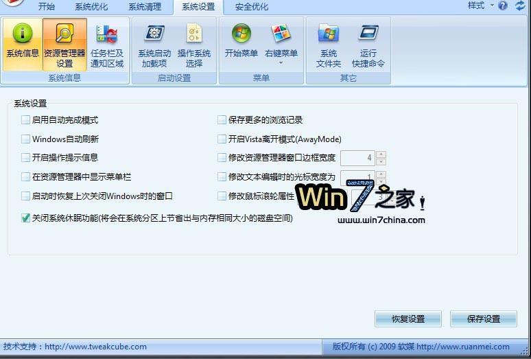 此外,從Vista時代,由于睡眠功能的存在,休眠功能其實已經(jīng)趨向于可有可無了,同時,禁用休眠功能還可以節(jié)省出于內(nèi)存同等大小的硬盤空間,因此,我們建議大家使用Windows 7優(yōu)化大師 (點此下載) 或魔方 (點此下載)中的系統(tǒng)設置關閉休眠功能。