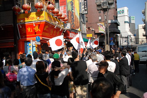午后1點(diǎn)左右,大概有30人左右自稱前去為池袋做街道清掃,集結(jié)到池袋電車站北口附近的“陽(yáng)光城”中國(guó)物產(chǎn)店門前。這群人手舉著日本國(guó)旗,對(duì)“陽(yáng)光城”進(jìn)行游行抗議。
