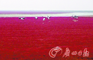 在美麗、富饒的遼河三角洲的海岸灘涂上,延綿百里、大片地生長著一種生命力頑強的潮間帶植物堿蓬草。堿蓬草每年四五月間長出地面,初為綠色,由于受海水的浸泡,太陽光照射下漸由綠變紅,9月至11月,呈紫紅色。秋風吹拂下,紫紅色的堿蓬草涌起重重的波浪,“紅海灘”因此得名。