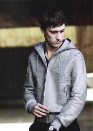 把厚重而奢華的鱷魚皮做成一件輕松休閑的連帽衫真是一個令人興奮的主意。灰色能讓體量輕巧起來,溫暖的絨布里子以及與針織面料的無縫縫合技術,讓整件皮衣在細節(jié)上有了親和力。讓兩種不同的材質(zhì)沒有縫線、不見針腳地縫合在一起,沒有增添任何厚度,是愛馬仕秋冬男裝上的新看點,由此而衍生了一些新面料:鱷魚斜紋織物、澤西水貂皮、薄紗貂皮……
